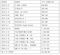 防弹少年团自2013年出道专辑《2 COOL 4 SKOOL》到今年2月发行的《MAP OF THE SOUL:7》的共14张专辑,创下了2032万9305张的累计销量。