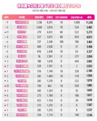 防弹少年团在9日公布的偶像排行榜9月第4周(21.9.27~21.10.3)排行榜中,音源分数1336分、YouTube分数8291分、社交分数1608分等,以总分11245分排名第一。