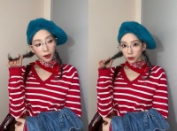 泰妍身穿红色条纹、灯芯绒短裙、比头发大很多的青绿色帽子,唤起了90年代的时尚。 身高也是系着腰带的牛仔裤,奶油色衬衫,还有粉色针织衫,完成了那个时期的王者装束。